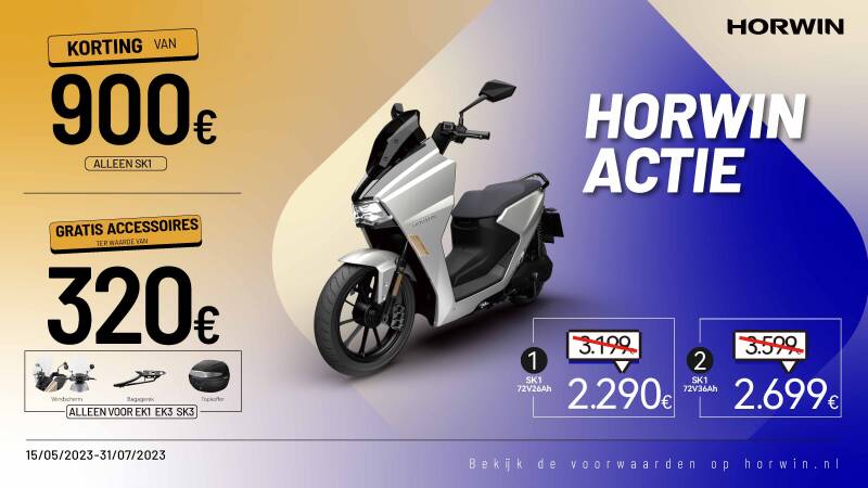 De Horwin actie is van toepassing op de EK1, EK3, SK1 en SK3. De promotie actie loopt van 15 mei 2023 t/m 31 juli 2023 en is enkel geldig op aankopen en leveringen van nieuwe voertuigen gedurende deze periode en zolang de voorraad strekt.